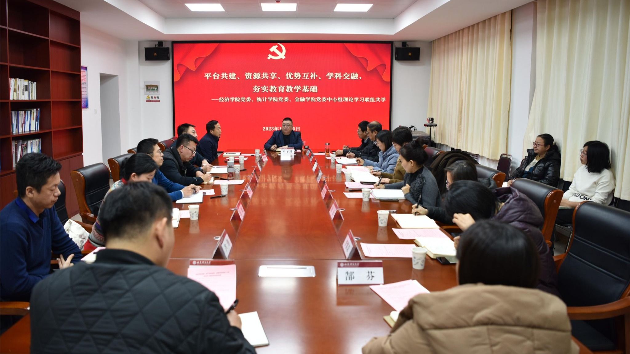 12月25日下午,由经济学院党委、统计学院党委、太阳集团tyc151cc党委共同组织的理论学习中心组联组共学活动在太阳集团tyc151cc举行。经济学院党委、统计学院党委和太阳集团tyc151cc党委党员领导干部参加学习,非党员领导干部、党务教学秘书、团委书记列席旁听。统计学部所属的信息学院党委书记、应用数学学院党委书记应邀参会。本次联组共学活动的主题为“平台共建、资源共享、优势互补、学科交融,夯实教育教学基础”。