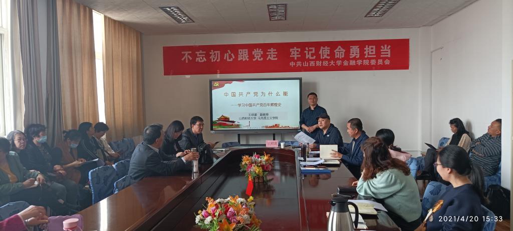 为全面学习贯彻习近平总书记在党史学习教育动员大会上的重要讲话精神,2021年4月20日下午,学院邀请学校党史教育宣讲团王绍源老师做题为“中国共产党为什么能--学习中国共产党百年辉煌史”的专题报告,我院全体教师参加本次活动。