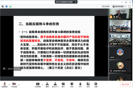 讲座第二部分,王相军副会长向我们介绍了当前反腐斗争的形势,鼓励青年要推进自我革命,勇于坚持真理,修正错误,不忘初心,牢记使命,以史为鉴,开创未来。