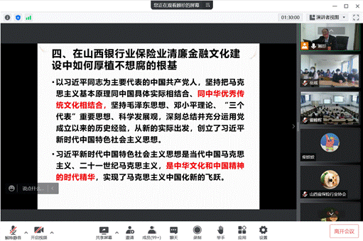 讲座第四部分,王相军副会长向我们讲解了在山西银行保险业清廉金融文化建设中要如何厚植不想腐的思想。首先,王相军副会长向我们介绍了清廉廉洁的本义,并结合时代要求丰富了清廉廉洁的内涵;接着从以下四个方面回答了怎样在山西银行保险业清廉金融文化建设中这一思想根基:第一、从中华民族的发祥地——黄河中下游根祖文化中汲取养分;第二、从山西古代廉吏文化中汲取坚守道义;第三、从晋商诚信文化中获得经商伦理;第四、从山西红色文化中赓续血脉。