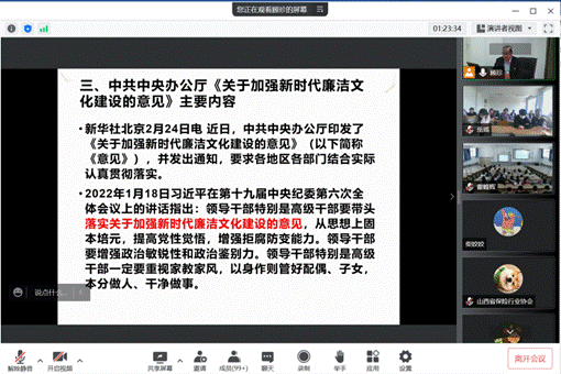 讲座第三部分,王相军副会长带领我们学习了中共中央办公厅《关于加强新时代廉洁文化建设的意见》主要内容,要求我们要提高自我防范能力,坚定理想信念,严守自身道德底线,始终保持对纪律的尊崇和敬畏。