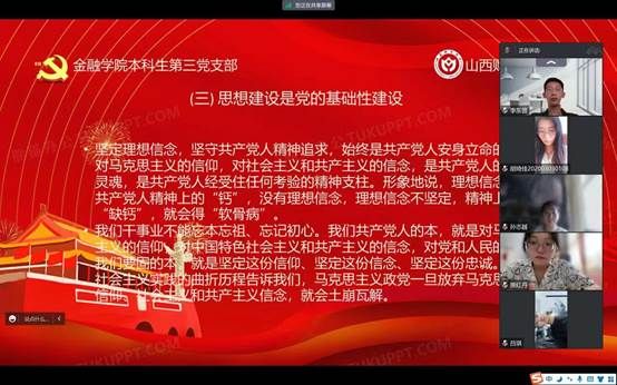 概要:继上次本科生第三党支部预备党员原红丹带领大家学习第十六章的内容后,在8月13日进行了第十七章和第十八章的学习,本讲的主要内容是“以自我革命精神推进全面从严治党”和“坚持不懈用新时代中国特色社会主义思想武装头脑指导实践、推动工作”,本讲由本科生第三党支部预备党员张乐燕带领大家学习,本科生第三党支部邱马玥主持并总结发言。