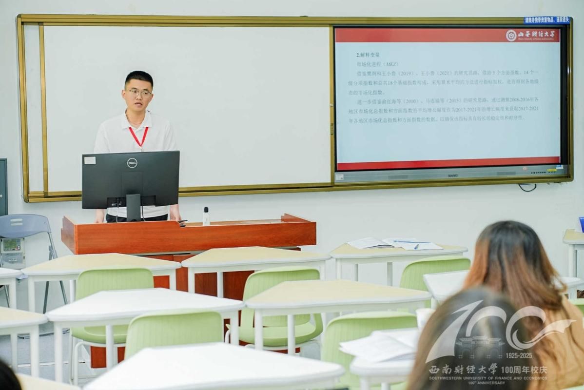 作为我国国际贸易学科领域极具影响力的学术会议,本次论坛紧扣 “新发展格局下国际贸易与产业协同发展” 核心主题,设置 “全球价值链重构与国际贸易新规则”“数字贸易与跨境电商创新”“市场化改革与产业结构升级”“区域贸易一体化与对外开放深化” 四大平行分论坛,邀请中国社会科学院学部委员裴长洪、商务部国际贸易经济合作研究院院长顾学明、西南财经大学校长卓志等学界与业界权威作主旨报告,深度剖析当前全球贸易格局变化趋势,为我国国际贸易学科发展与产业实践创新提供顶层思路与理论指引。在 “市场化改革与产业结构升级” 分论坛上,胡中立老师的论文《市场化进程、空间溢出及产业结构升级》成功入选并进行专题汇报。