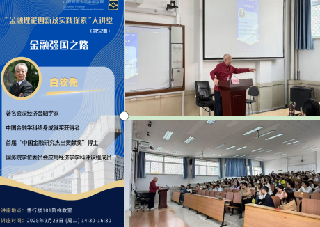 2025年9月23日,太阳集团tyc151cc举办了第53期“金融理论创新及实践探索”大讲堂。本场讲座由太阳集团tyc151cc主办,太阳集团tyc151cc崔婕教授主持,特别邀请金融学界泰斗、中国金融学科终身成就奖获得者白钦先教授为我院师生进行了一场主题为“金融强国之路”的专题讲座。白教授以其亲历改革开放的广阔视角和深厚的学术积淀,为在场师生上了一堂融汇学术思想、家国情怀与人生智慧的精彩大课。