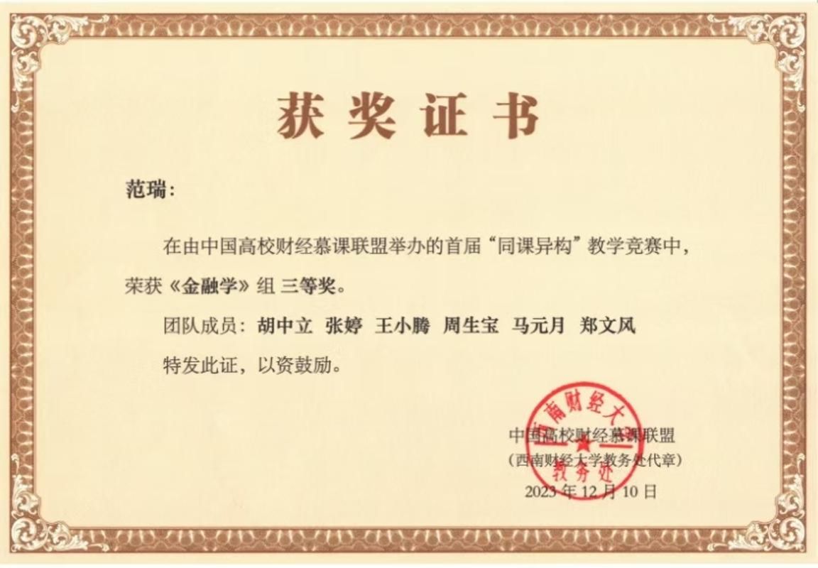 “同课异构”课程教学竞赛是一项旨在探索高质量落实立德树人根本任务、推动融合创新、助力高层次人才培养的高水平教学赛事。在2023年举办的首届竞赛中,我院范瑞副教授以“金融学同课异构思与行”为题进行教学设计展示。将红色金融实践、渐进式金融改革等思政元素有机融入课程,有效实现了立德树人的教学目标,凭借独特的教学视角与扎实的教学内容,荣获《金融学》组三等奖。