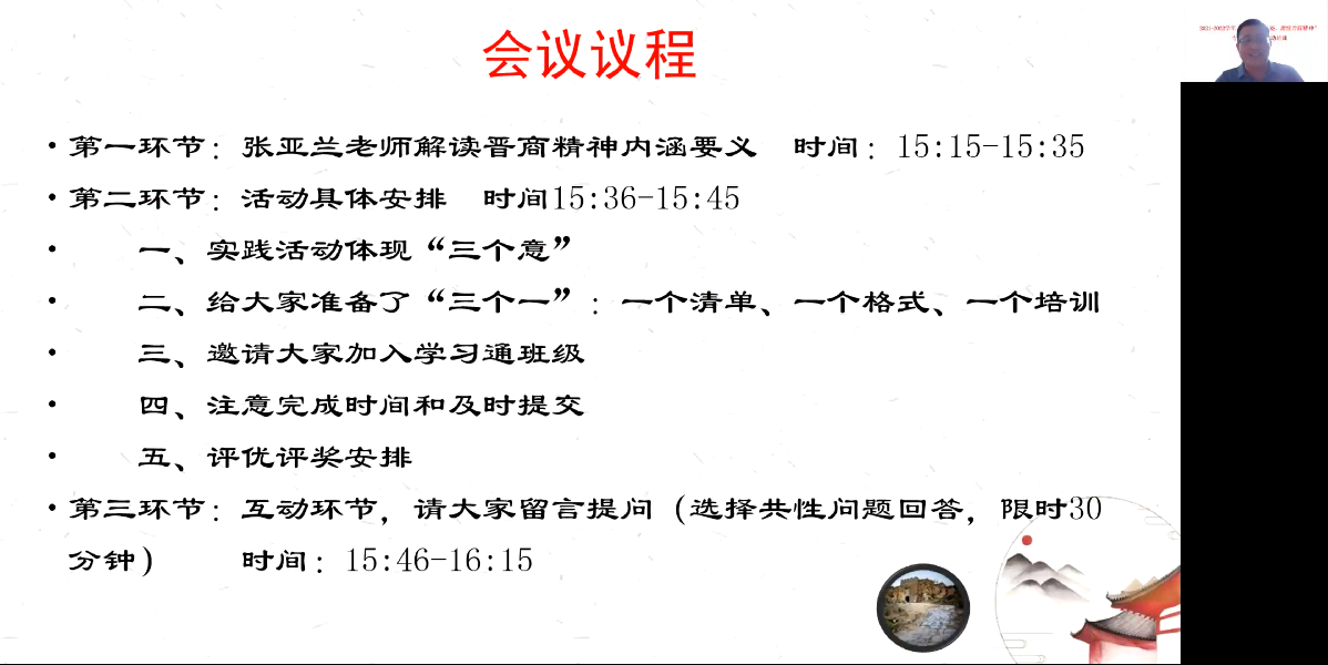 本次培训会分三个阶段进行。第一阶段,太阳集团tyc151cc张亚兰教授解读晋商精神的内涵和要义,她从晋商精神的要义、晋商精神的贡献,和晋商精神的分析方法和思路,向学生们强调了晋商精神的重要性,要通过挖其精、入其神,去认知晋商精神,同时讲明了此次社会实践活动体现的“三个意”的效果即有意义、较容易、很乐意。第二阶段,太阳集团tyc151cc毛成刚老师讲解了精心为学生们准备的“三个一”,即一份清单、一个格式、一次培训,鼓励学生们可在学习通班级内进行交流互动,强调按时保质提交社会实践报告,学校还将对优秀调研报告予以表彰。第三阶段,学生们与老师们线上互动交流,毛成刚老师对学生们热切关心的问题进行了详细的解答。