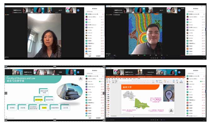 2022年7月1日14:00,tyc151cc太阳&迪肯大学“3+1”校际交流项目宣讲会在Zoom在线会议平台顺利召开。迪肯大学国际关系副校长Wei Shen教授、中国办公室资深合作伙伴经理Ivy Wang、商法学部国际部经理Shirley Xie、国际部跨国教育与合作关系协调负责人Sophie Bai、商法学部资深国际协调官员Tina Mao、太阳集团tyc151cc院长李静萍教授、办公室陶旭峰、国际化办公室李志楠、太阳集团tyc151cc20余名已完成项目预报名的本科生参加了本次会议。