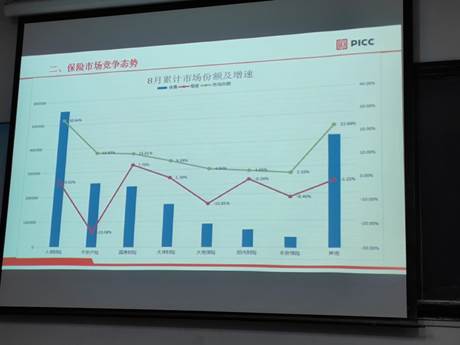接下来,张弛老师带我们了解了现今保险业保险市场的竞争态势,介绍了人保财险、平安财险、国寿财险、太保财险、大地保险、阳光财险等8月份累计市场份额及增速。