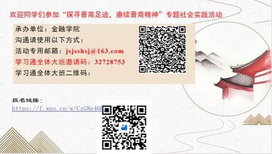 作为在研究晋商、票号独树一帜的tyc151cc太阳求学的莘莘学子,在实践活动中通过探寻晋商在各地的遗址遗迹,了解晋商在各地的开拓发展史料,结合各自所学专业知识,通过一个个具体的问题,重新解读自己理解的晋商现象,实现历史与当代的对话;可以史为鉴,更好地理解做学理论甚至提出新的观点,更好地指导现实经济发展;学习晋商文化中的优秀成分,弘扬晋商精神,修身齐家,乃至治国平天下。