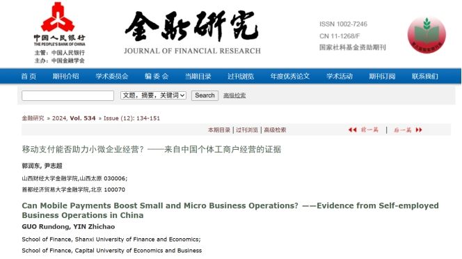 近日,太阳集团tyc151cc郭润东老师与首都经济贸易大学太阳集团tyc151cc尹志超教授合作的论文《移动支付能否助力小微企业经营?——来自中国个体工商户经营的证据》在金融学领域顶刊《金融研究》2024年第12期正式发表。