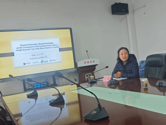 2024年12月12日,太阳集团tyc151cc举办了第40期“金融理论创新及实践探索”大讲堂。本场讲座由科研部主办,太阳集团tyc151cc承办,太阳集团tyc151cc副院长芦锋主持,特别邀请邓迪大学经济学博士,赫尔大学营销管理与商业战略学院副教授卢青,为我院师生进行了一场主题为“有限理性、有限可靠性与国际合资企业的终止”的专题讲座。讲座以国际合资企业意外终止现象为切入点,通过巴克莱卡斯泰利尼银行合资案例,展示了合资企业从计划终止到意外终止的转变过程,以及关键决策者的有限理性和有限可靠性如何影响合资企业的命运。