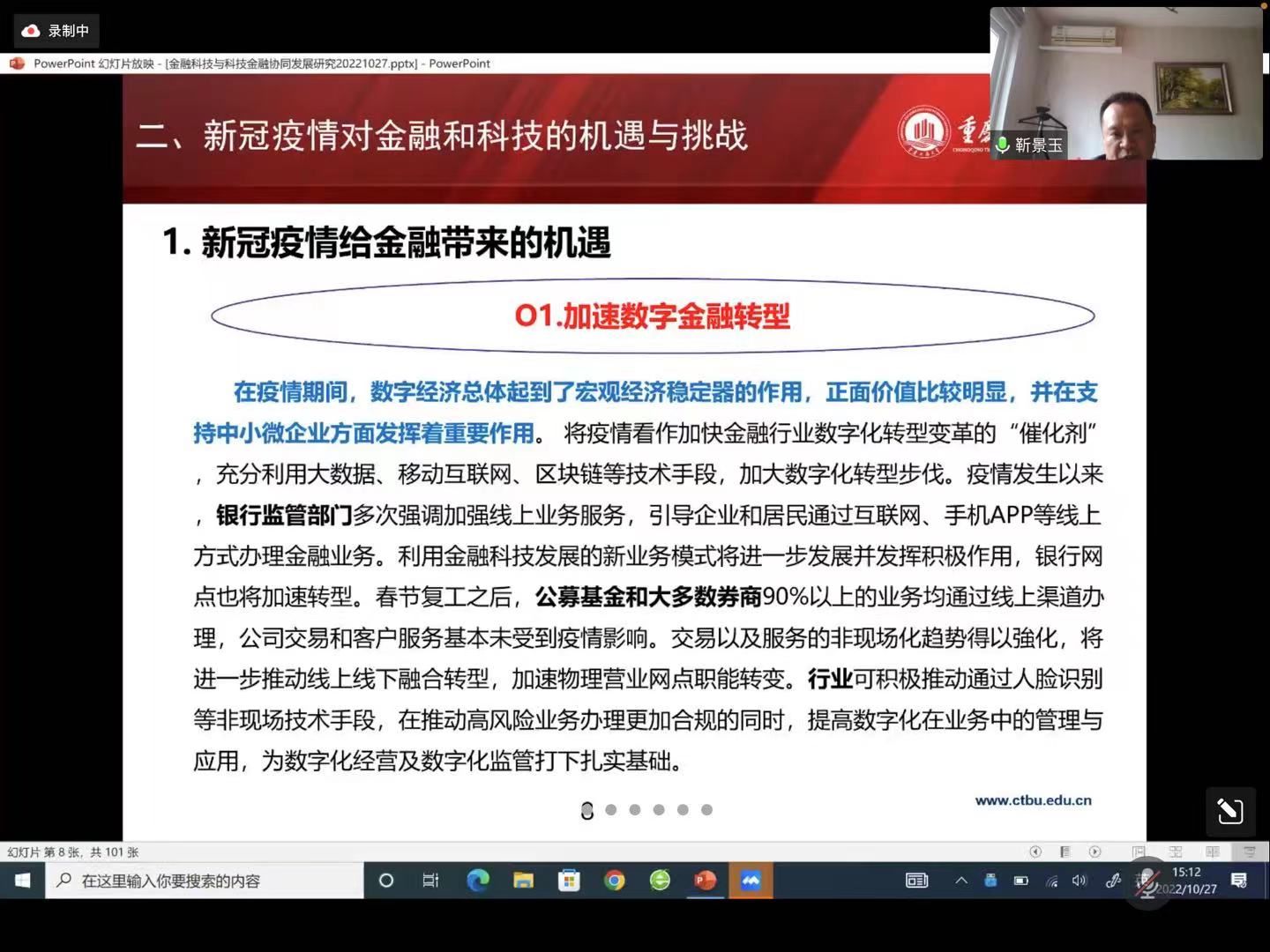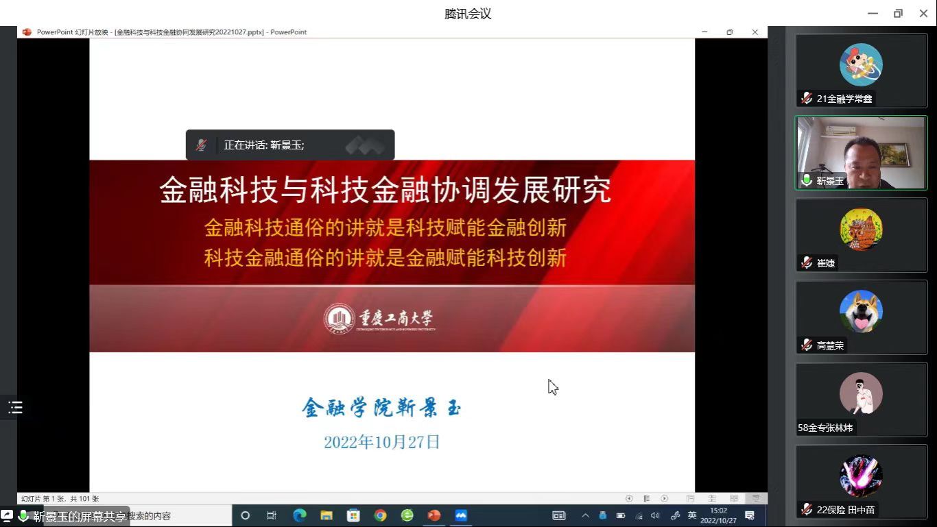 2022年10月27日下午15:00时,太阳集团tyc151cc举办了“金融理论创新及实践探索”大讲堂,由于疫情原因,本次会议通过腾讯会议的方式举办。
